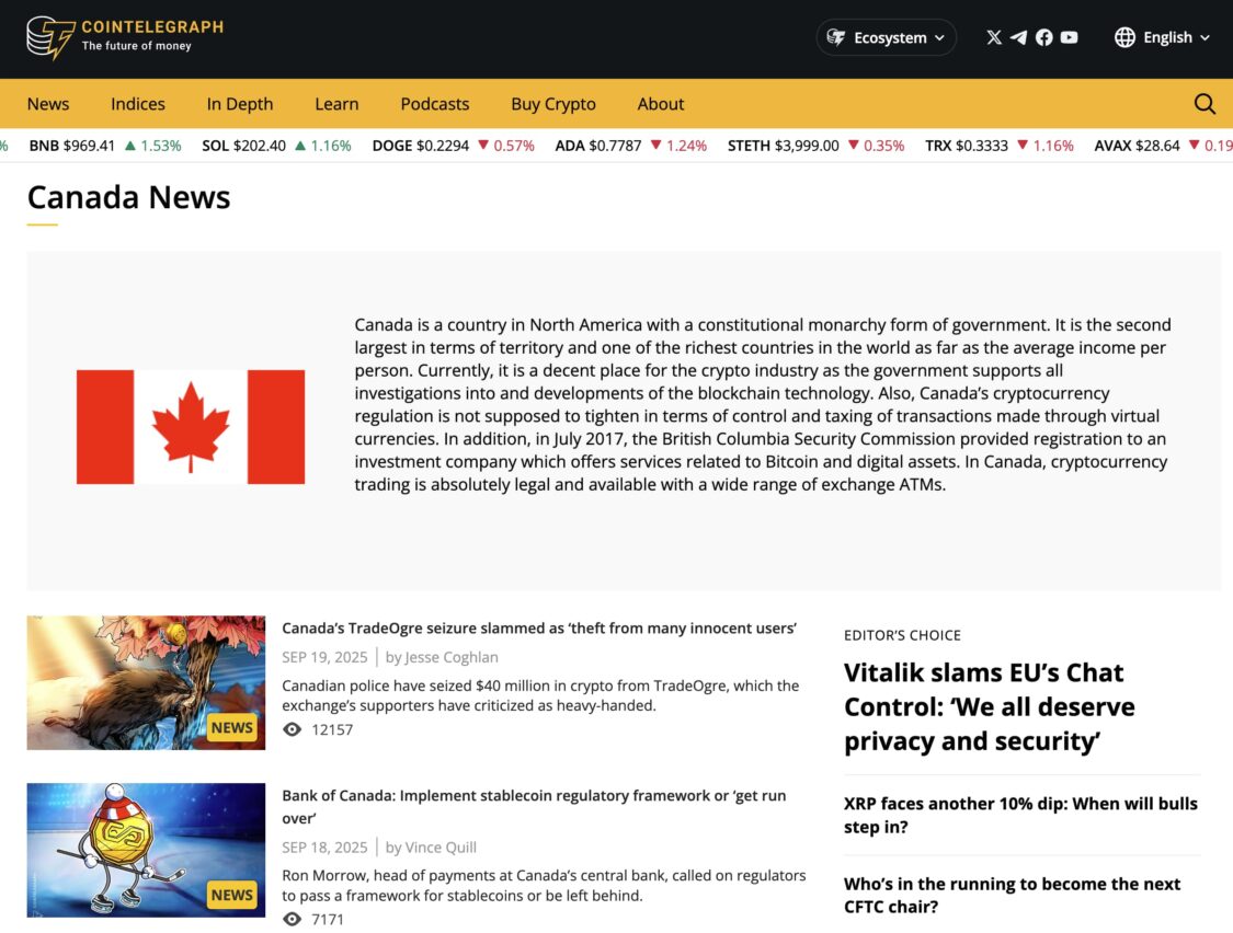 While Cointelegraph is a global cryptocurrency news platform, their Canada-specific tag provides focused coverage of Canadian crypto developments. This dedicated section filters content specifically relevant to Canadian investors, covering regulatory updates, institutional adoption, and market trends within the country.